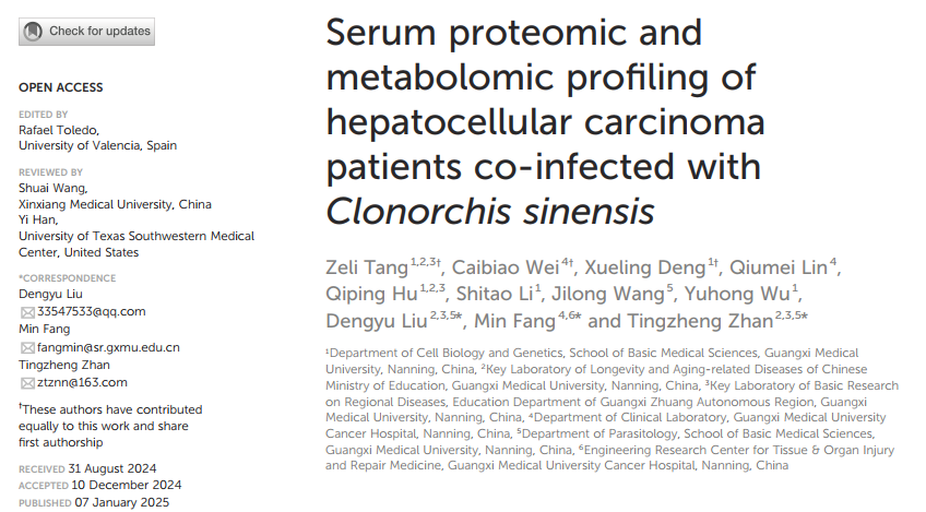 近日,公司战廷正教授、唐泽丽副教授团队与附属肿瘤医院检验科团队合作在国际权威期刊Frontiers in Immunology(IF=5.7,Q1,中科院大类二区)发表了题目为“Serum proteomic and metabolomic profiling of hepatocellular carcinoma patients co-infected with Clonorchis sinensis”的研究成果。