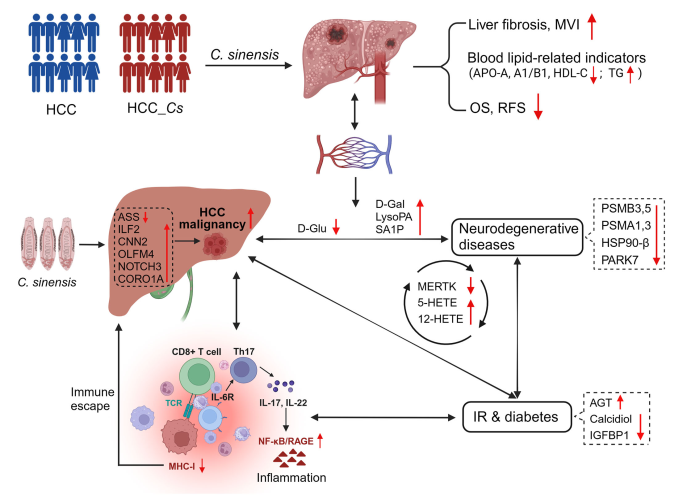 华支睾吸虫感染是肝细胞癌(HCC)的重要危险因素,但其潜在机制尚不清楚。本研究探究了华支睾吸虫感染对HCC患者血清蛋白质组学和代谢组学的影响,为阐明华支睾吸虫介导的HCC发展提供了有力的证据,也为合并感染的HCC患者鉴定了潜在的治疗靶标。